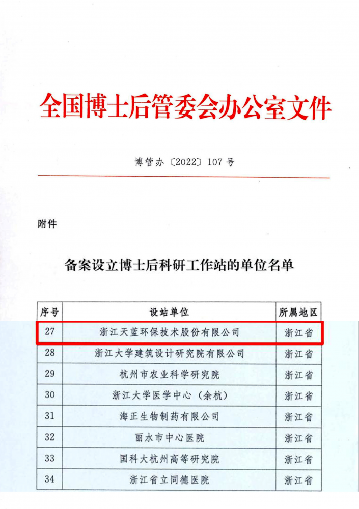 浙江天藍環保技術股份有限公司獲批國家級博士后工作站,標志著天藍環保在人才隊伍、技術創新和科研平臺建設上的重大突破。